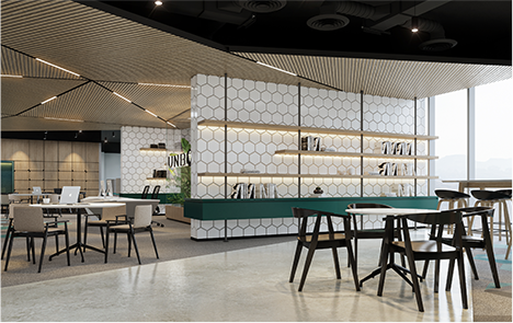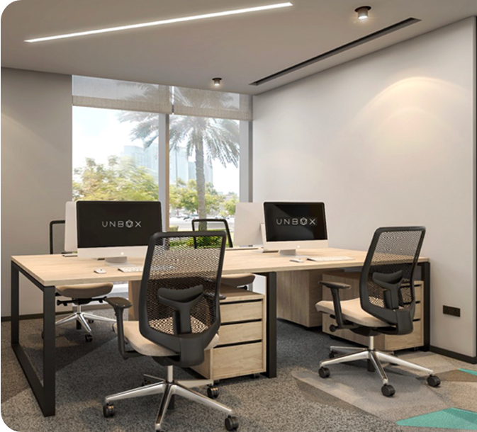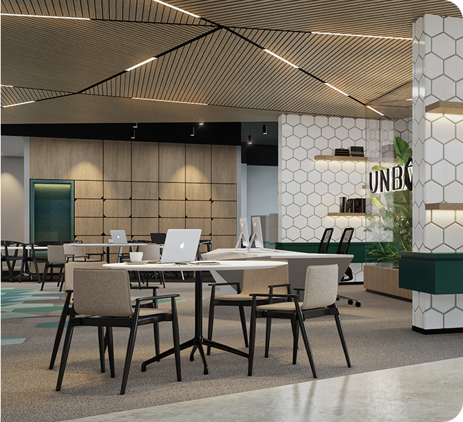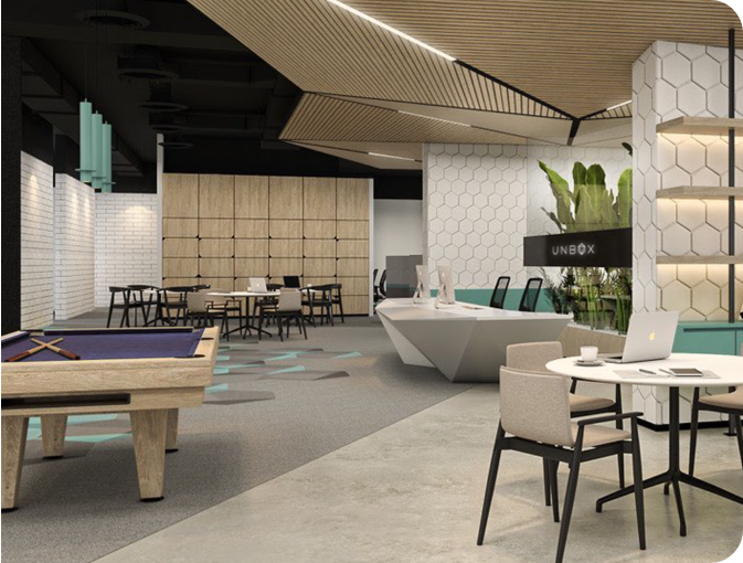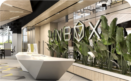 Experience UNBOX spaces, designed to nurture creativity, providing a unique work environment for innovators to thrive. Our origami-inspired layout embodies our mission: to foster collaborative solutions by uniting imaginative thinkers within an inclusive and harmonious environment.
